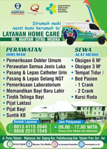 Selain itu pelayanan unggulan rumah sakit Maryam Citra Medika bukan hanya dari UGD sampai ke rawat inap. Bahkan setelah pulang pun pasien dan keluarga telah disediakan layanan Home Care bagi pasien yang ingin mendapatkan pelayanan kesehatan di rumah tanpa perlu repot atau bagi pasien dan keluarga yang terkendala transportasi. Seperti layanan periksa dokter, rawat luka, nebulizer, pasang/lepas kareter, lepas/pasanh NGT dampak pemeriksaan lab bisa dirumah.
